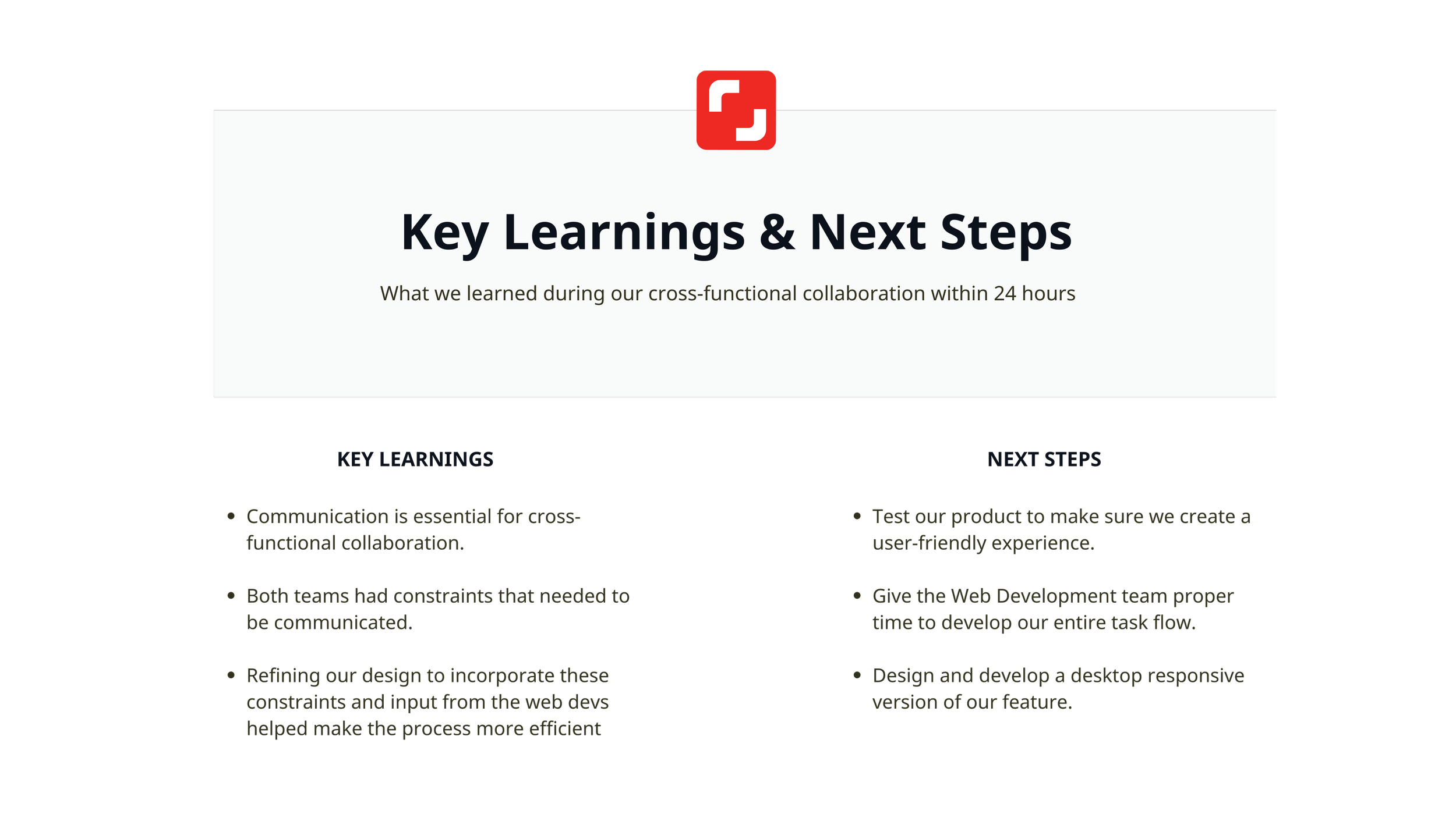 After handing off our wireframes we finalized our presentation and prepared ourselves to present. We learned a lot from each other in those 24 hours. Our key learning and next steps are as follows: