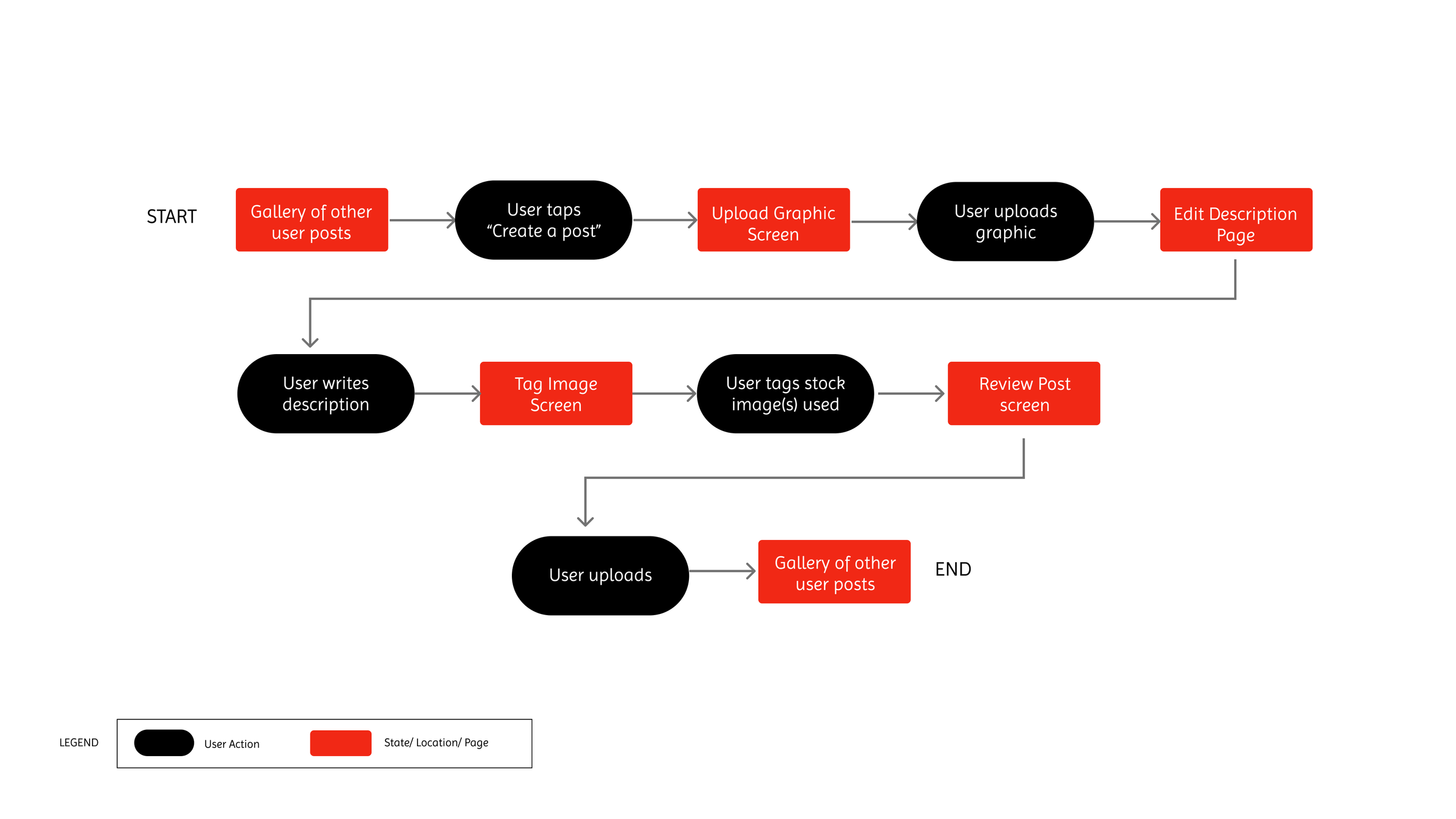 We created our task flow with the concept of helping Sara create a post, upload it, tag the stock images used, and upload that post to a gallery of other user posts.
